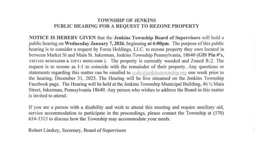 THE JENKINS TOWNSHIP PLANNING COMMISSION MEETINGS WILL NOW BE AT 7:00 PM ON THE 3RD THURSDAY OF EACH MONTH